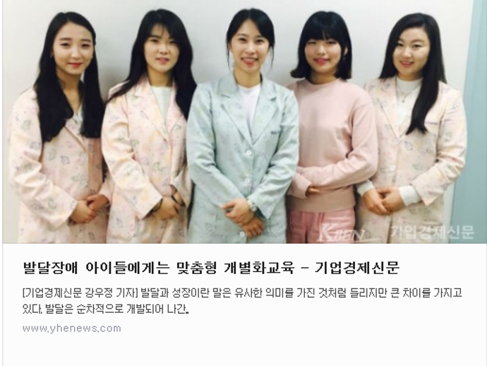 센소리발달센터2018년 11월 16일1분 분량기업경제신문 인터뷰기업경제신문에서 특수교육의 주제로 신문기사 인터뷰요청이 있었습니다 특수교육육을 하고있는대상자, 부모님들께 유익한 기사가 되길 바라며 다음,네이트, 구글 등 포털싸이트에서 '센소리발달센터'를 검색하시면 기사를 보실 수 있습니다.